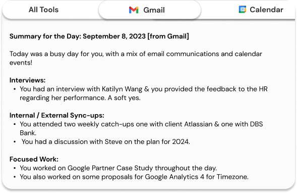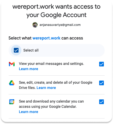 Provide read-only permissions to your work reporting tools like Gmail, Google Drive, Calendar & more (coming soon.)